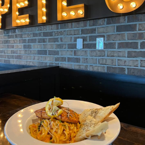 “Blackened salmon, linguini in a red pesto cream, with a balsamic glaze” pairs well with our Pete’s pinot