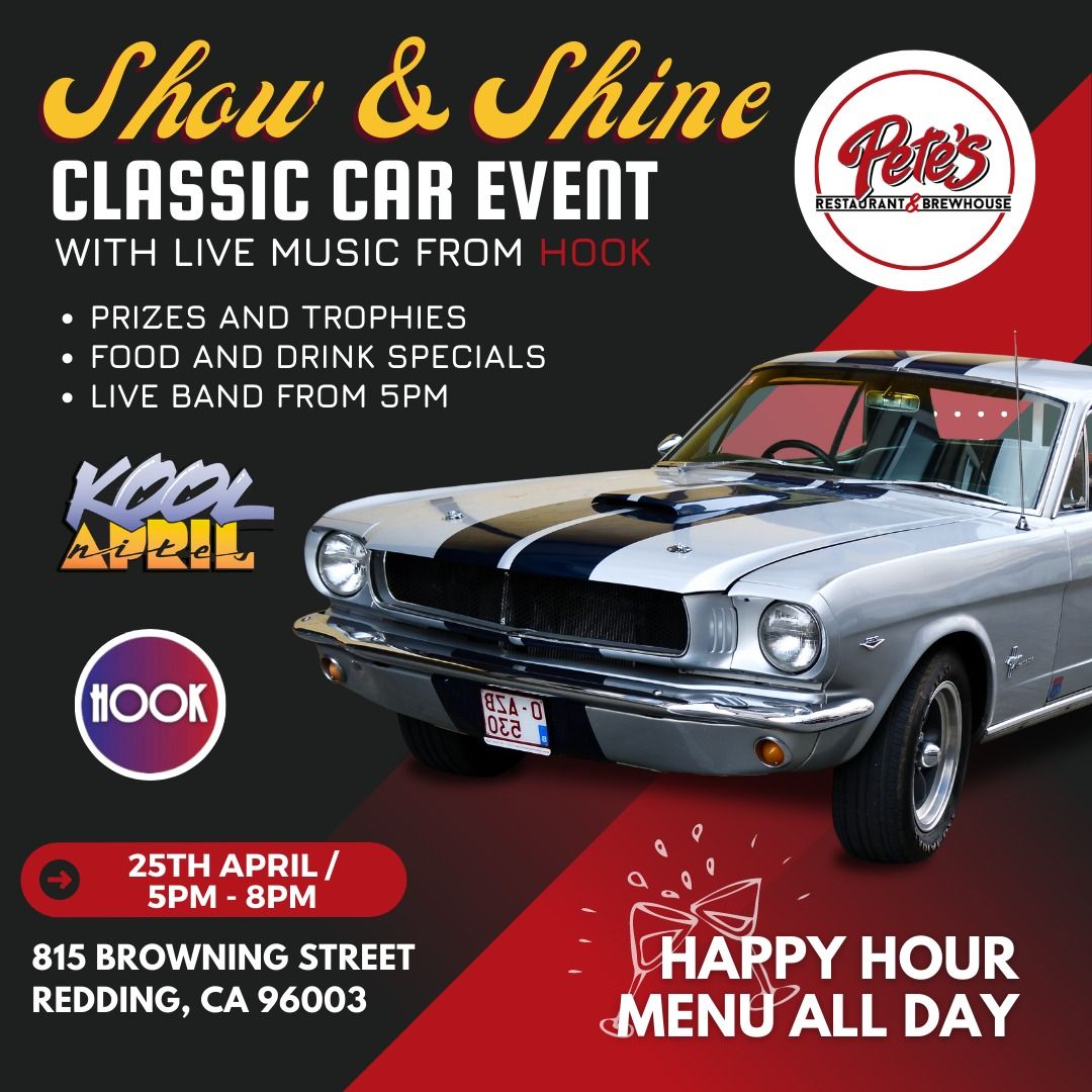 Join us at Petes - Redding on the 25th April 2023. With Live music from Hook. Live band from 5pm - 8pm. Food and drink specials. Win prizes and trophies in our Show and Shine event.